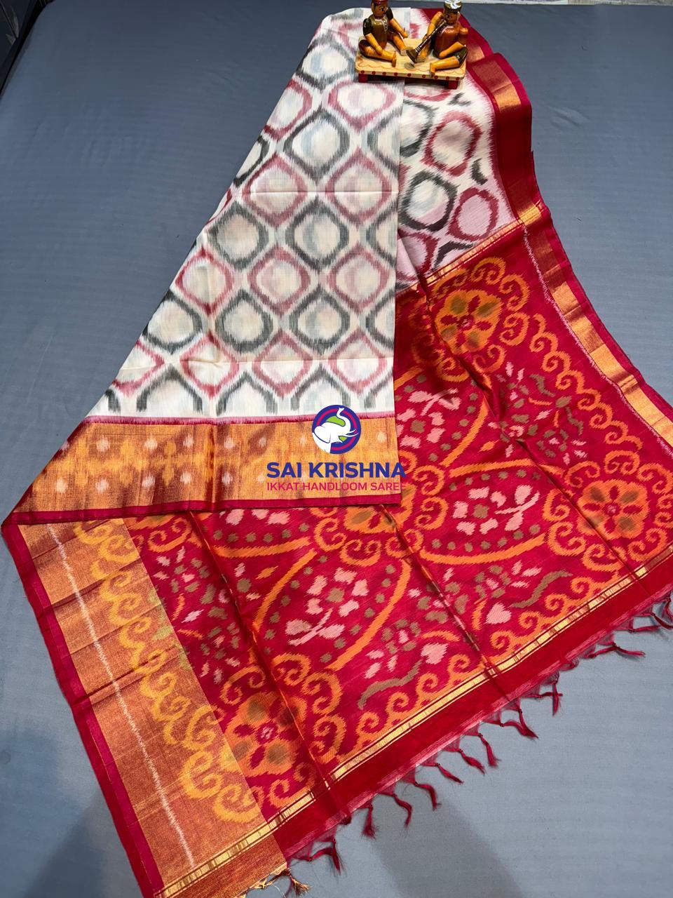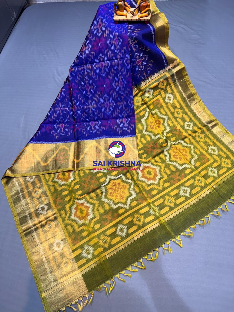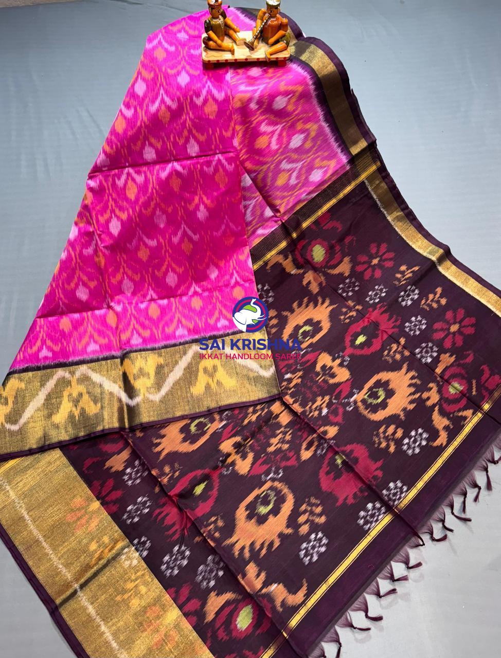 Experience the timeless elegance of a traditional Narikunja design Ikat silk saree, featuring intricate floral and animal motifs that celebrate nature. The saree showcases the exquisite Ikat weaving technique, renowned for its unique blurred patterns and ...