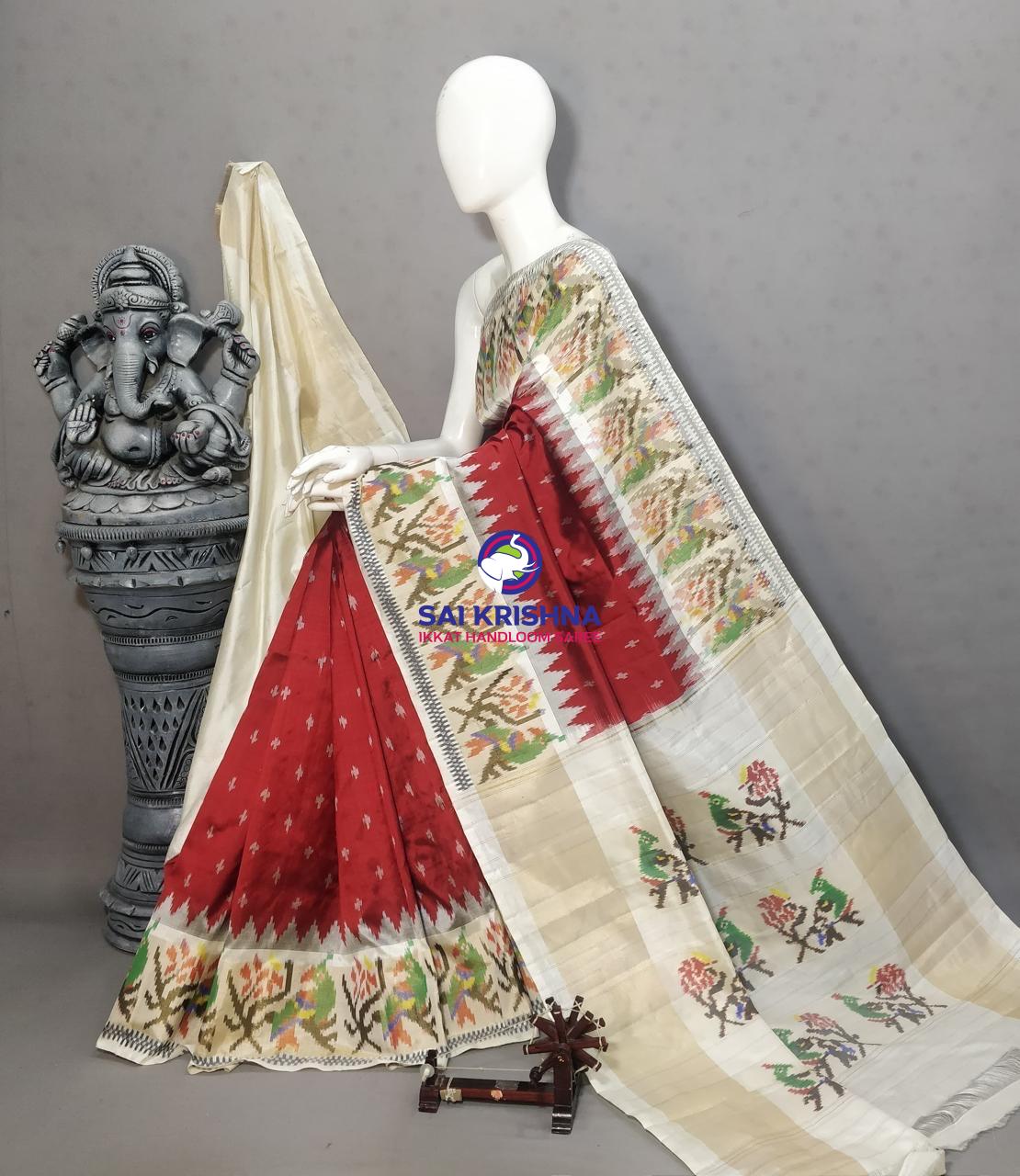 1. **Ikkat Silk Saree**: Ikkat is a dyeing technique used to pattern textiles. In Ikkat weaving, the threads are dyed before being woven into fabric, resulting in intricate and unique patterns. The silk base adds a luxurious feel and shine to the saree.